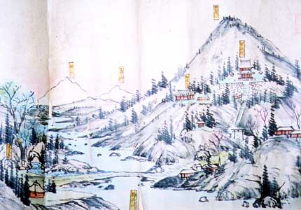 現在のくしふる神社周辺です。神代川は広く豊かで、天真名井からはこんこんと湧き出ています。神代川(じんだいがわ)も天真名井(あまのまない)も現存していますが、開発により見る影もありません。山林の伐採により水量も著しく減少しています。 明治(1868〜)まではこのように風光明媚な高千穂郷でした。私たちはとても大切な物を失ってしまったようですね。