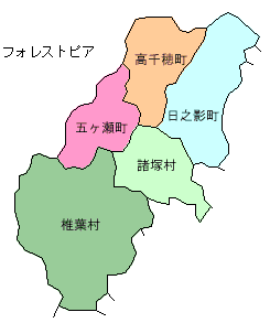 が、現在の県北フォレストピア圏域です。昔の西臼杵郡と同じ範囲です。(現在の西臼杵郡は高千穂・五ヶ瀬・日之影の三町です。)昭和62年に宮崎県が選定したもので、西臼杵郡と東臼杵郡に分断された高千穂郷が再び一つになるエリア呼称です。