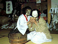 いざなぎ、いざなみの二神が御二人で仲良く酒を醸し、飲むほどに酔うほどに男、女和合のかまけわざ舞です。舞の心の中には五穀豊穣、家庭円満の願いが込められています。