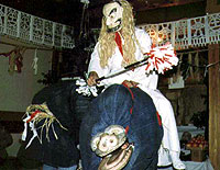 別名”四人鞭”とも呼ばれる竜神の舞に続いて山の神がシシ二頭を引き連れての舞です。シシは鹿と同じように山の神の従者だと考えられています。神庭で山の神とたわむれ神楽宿の外に出たシシは連れだって村内をくまなく回り、各戸の無病息災を山の神に代わって見届けます。